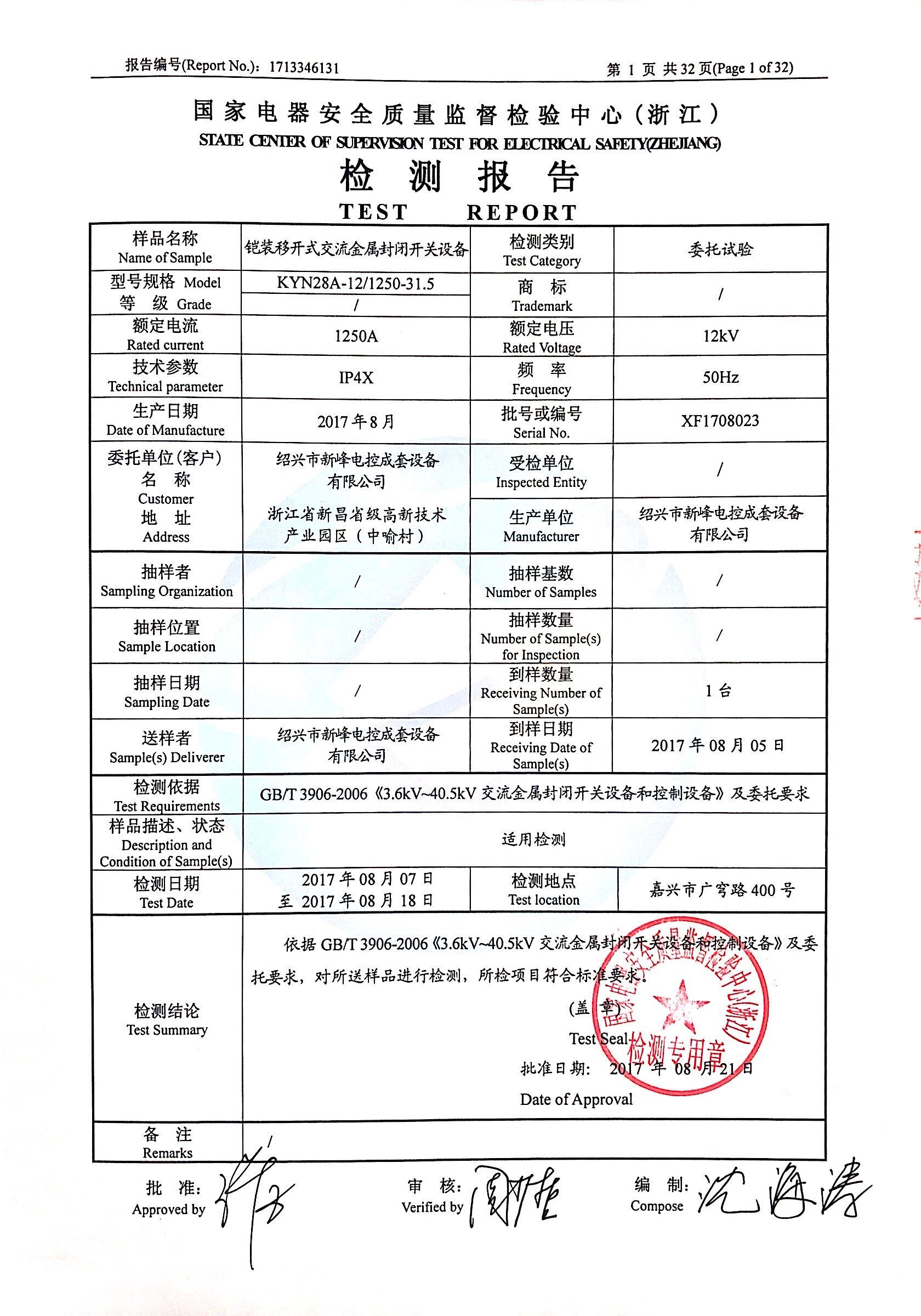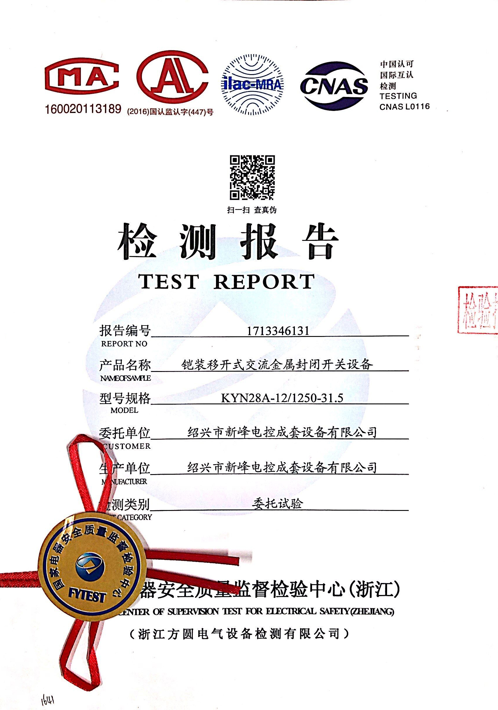 KYN28A-12/1250-31.5-高壓設(shè)備檢測報告