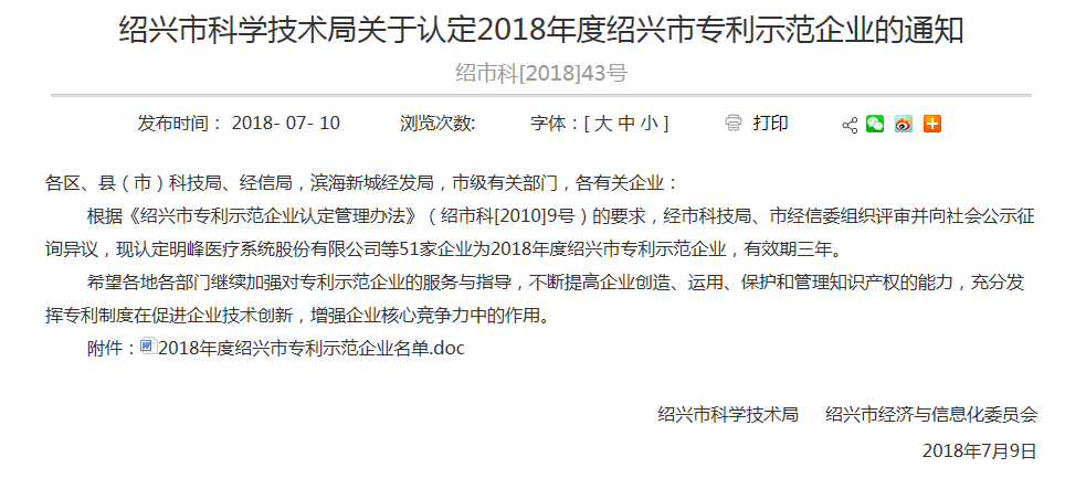 2018年被評(píng)為紹興市專利示范企業(yè)